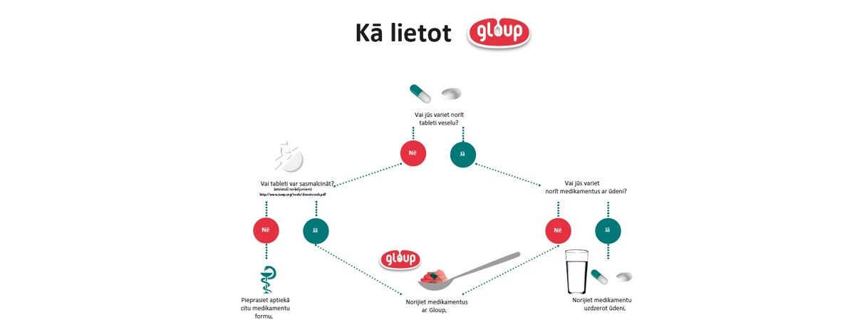 Ponieważ żywność nie jest przeznaczona do wchłaniania leków, nie jest najlepszym wyborem. Gloup jest specjalnie zaprojektowany do przyjmowania leków i posiada certyfikat wyrobu medycznego. Pomaga osobom, które mają problemy z połykaniem leków doustnych. Gloup to żel pokrywający tabletkę i umożliwiający łatwe zsunięcie jej do gardła. Gloup maskuje gorzki smak leku i nie wpływa na skuteczność podawanego leku. Jest to zarejestrowany wyrób medyczny klasy I, opracowany i udoskonalany we współpracy z różnymi uniwersytetami na całym świecie.